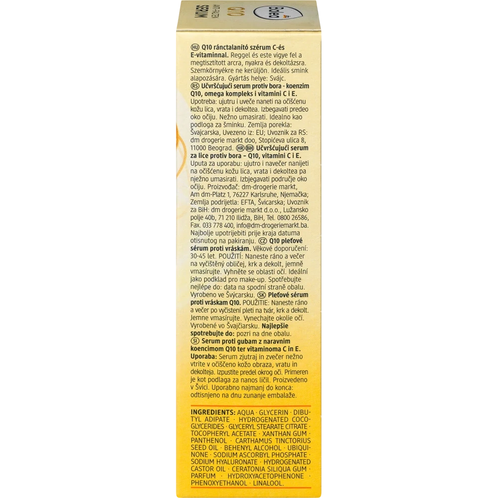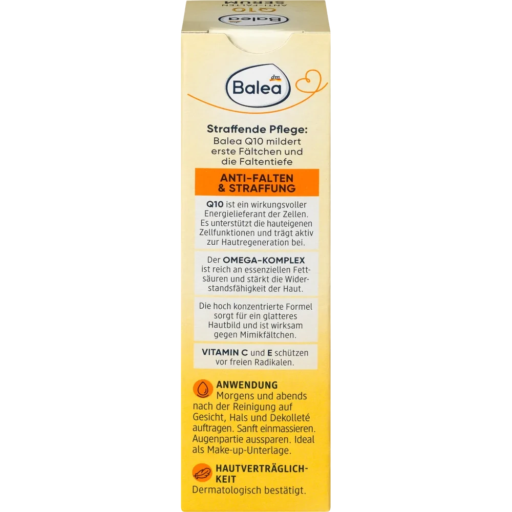 Balea Q10 Anti-Wrinkle Serum with Omega Complex is rich in essential fatty acids and strengthens the skin’s resilience. The highly concentrated formula ensures a smoother skin appearance and is effective against expression lines. Q10 is a powerful energy supplier for cells. It supports the skin’s own cellular functions and actively contributes to skin regeneration. Vitamin C and E protect against free radicals. Formulation without microplastics and without water-soluble purely synthetic polymers.