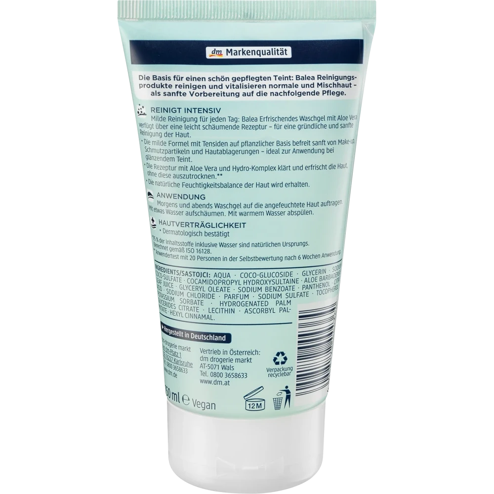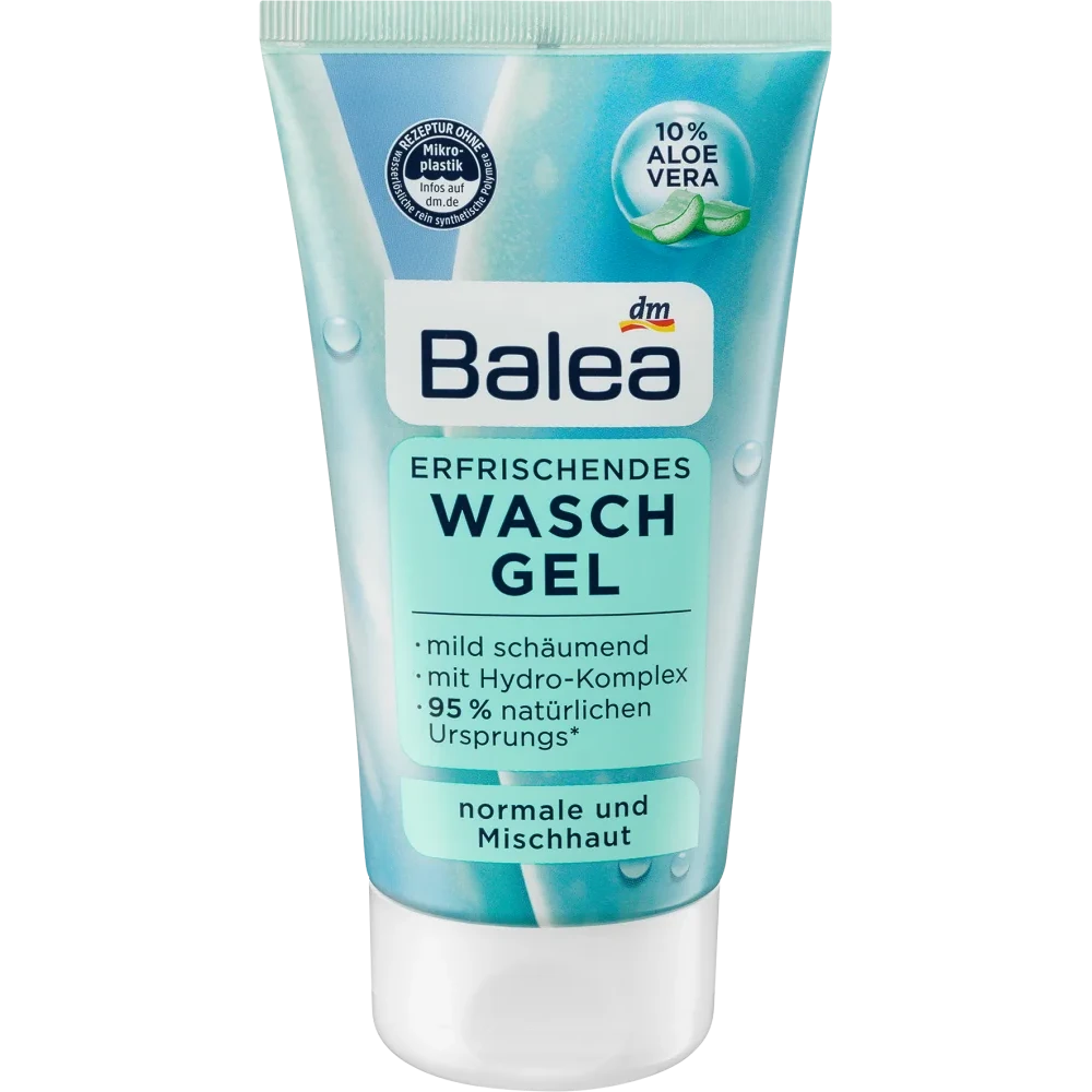 The refreshing face wash gel by Balea cleanses and revitalizes normal and combination skin as a gentle preparation for subsequent care. The refreshing face wash gel with aloe vera features a lightly foaming formula for thorough and gentle cleansing of the skin. The mild formula with plant-based surfactants gently removes makeup, dirt particles, and skin deposits—ideal for use on shiny complexions. The formula with aloe vera and hydro complex clarifies and refreshes the skin without drying it out. Formulation without microplastics and water-soluble purely synthetic polymers.