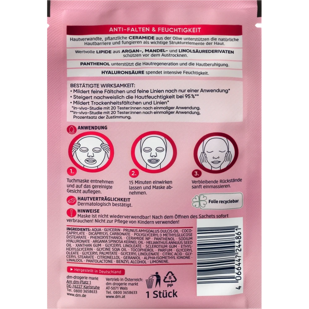 The Balea Vital Ceramide Sheet Mask visibly reduces fine lines after just one use* and increases skin moisture**. Skin-identical, plant-based ceramides from olives support the natural skin barrier and serve as important structural elements of the skin. Hyaluronic acid provides intensive moisture, and panthenol supports skin regeneration and soothes the skin. Valuable lipids from argan, almond, and linoleic acid derivatives protect against dryness.